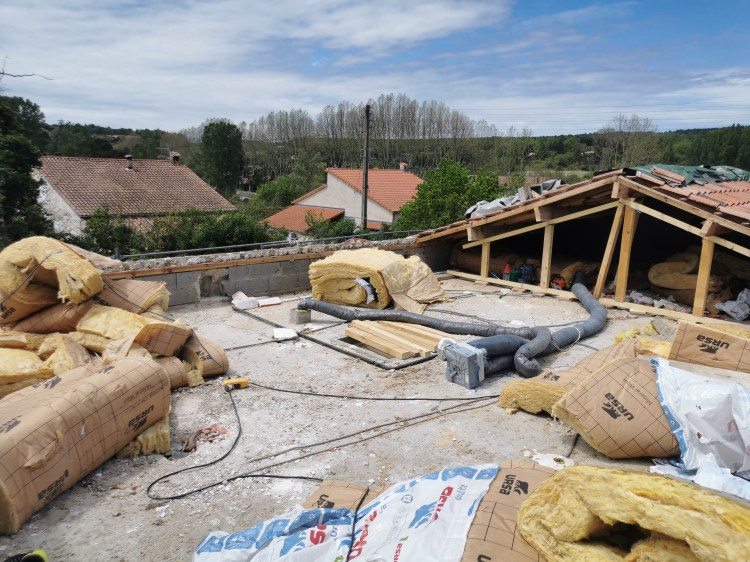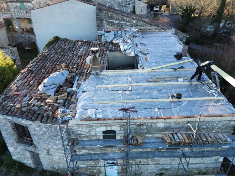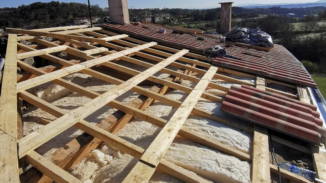 La toiture, vieillissante et à la charpente sous-dimensionnée, a été rénovée en remplaçant les poutres dégradées et en conservant les bonnes. L’isolation des combles et des rampants a été renforcée avant la réfection complète du toit, offrant une toiture saine, performante et un confort thermique apprécié des clients.