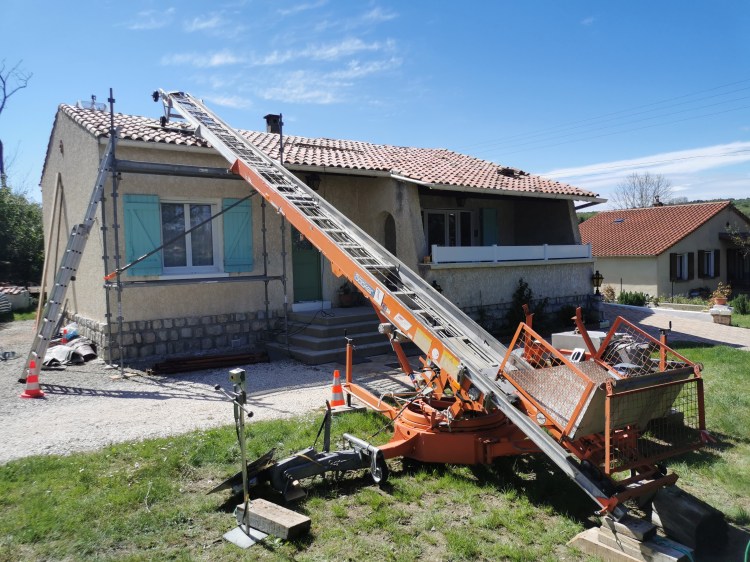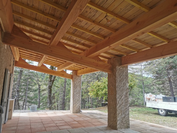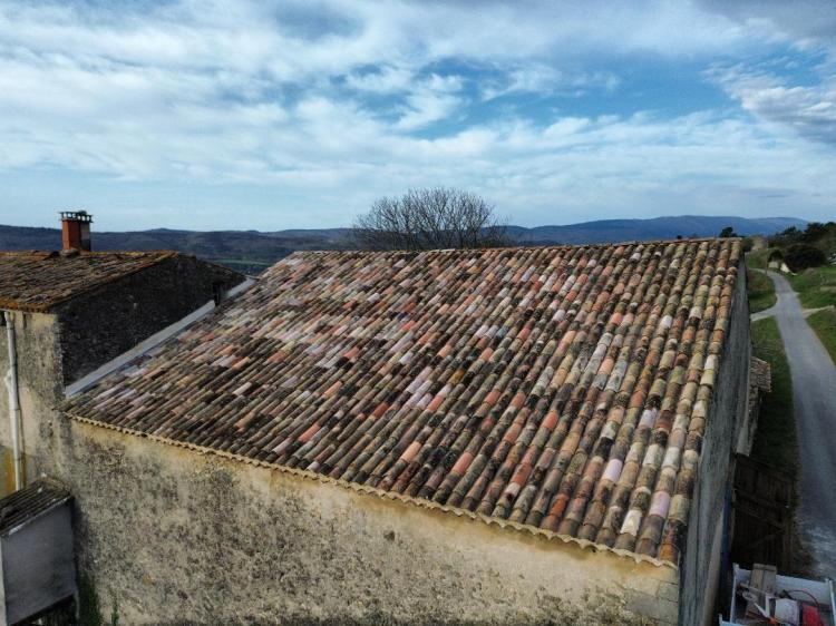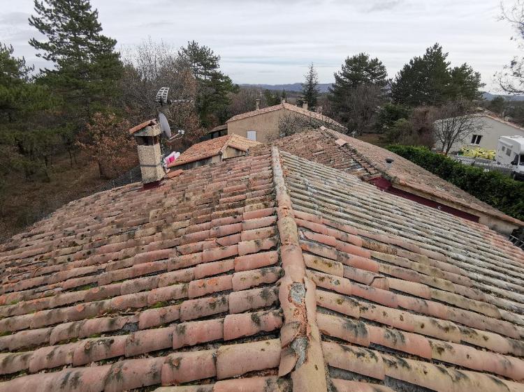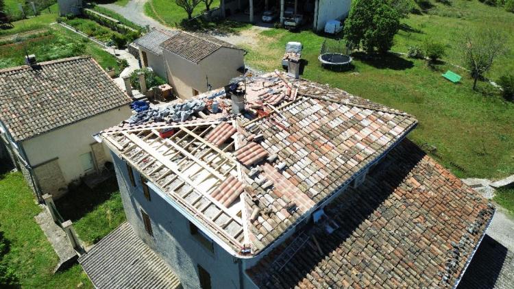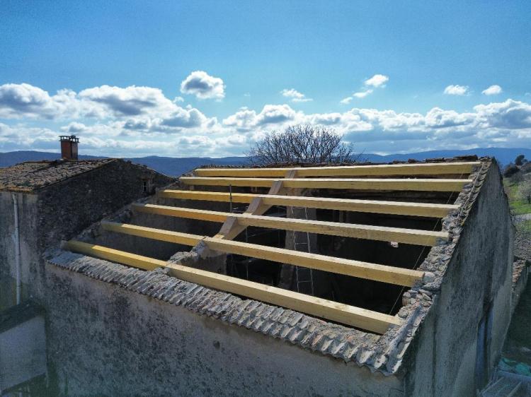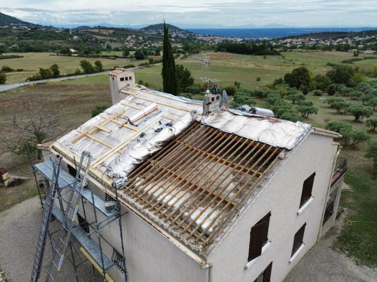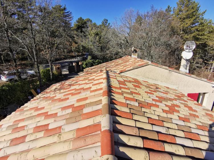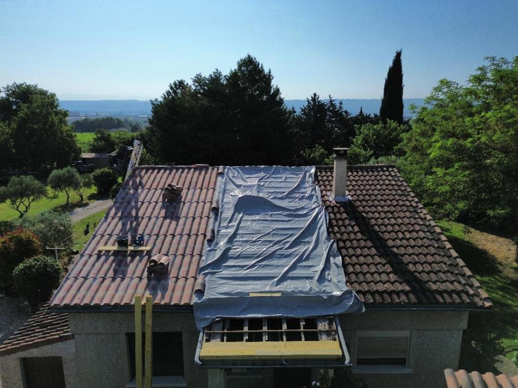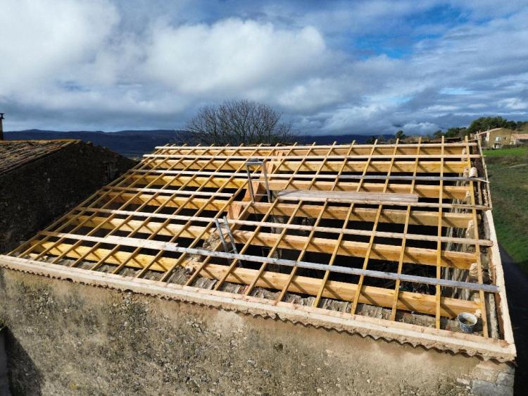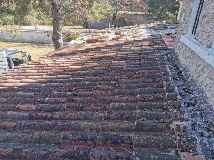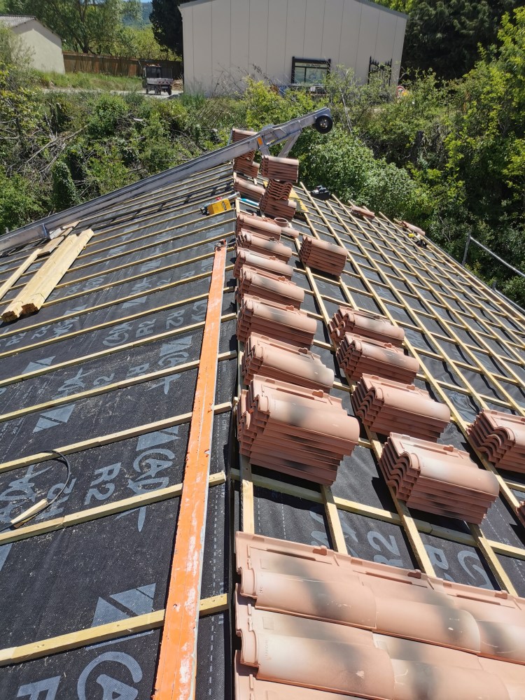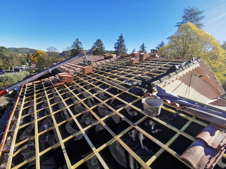 La charpente de cette villa des années 80 était attaquée par des capricornes. Nous avons réalisées deux fermes neuves, posé de nouvelles poutres, puis installé des tuiles Romane sur liteaux avec écran sous-toiture.