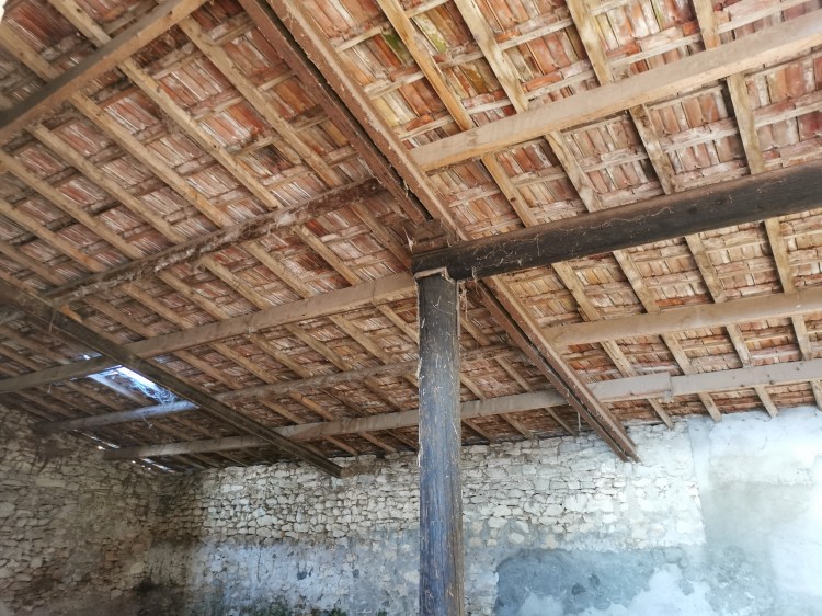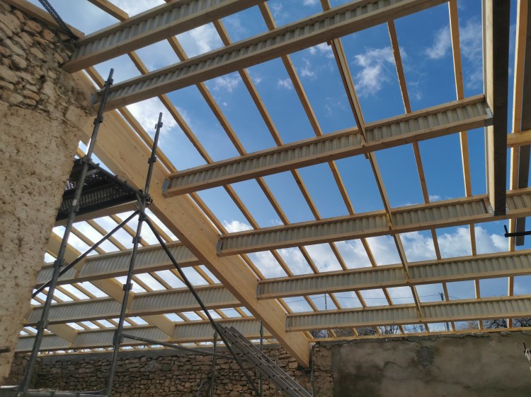 Cette toiture souffrait d’une charpente mal assemblée et sous-dimensionnée. Nous l’avons entièrement remplacée par une charpente en bois Douglas, avec voliges apparentes pour un joli rendu.