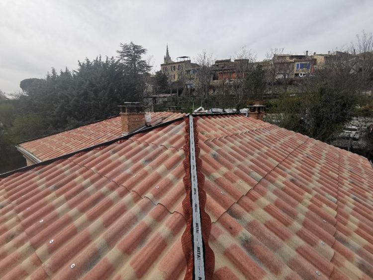 Cette toiture présentait de multiples fuites. Nous sommes donc intervenus pour y remédier, avec la pose d’une toiture neuve en plaques sous-tuiles et tuiles collées.