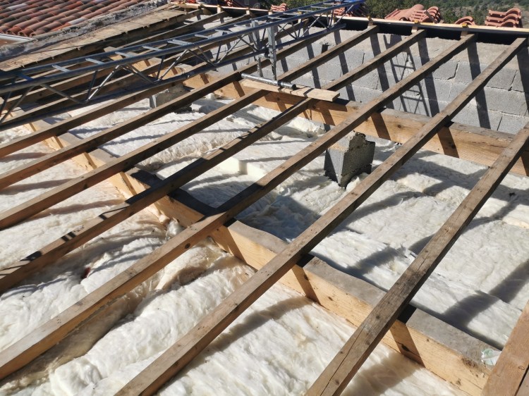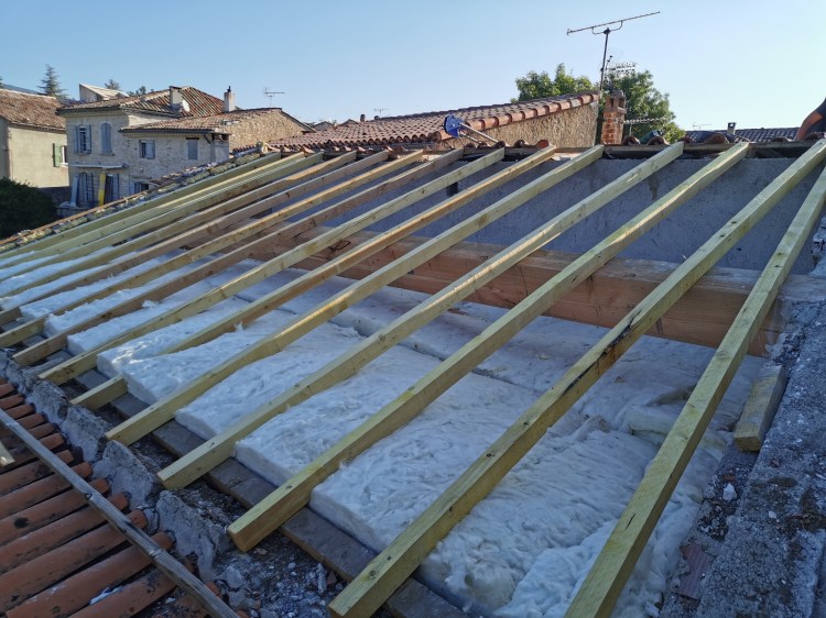 St Etienne les Orgues : 95m2 (dépose de toiture, pose d’isolant laine de verre 400mm, pose de poutres, pose d’écran de sous-toiture et des tuiles romane).